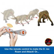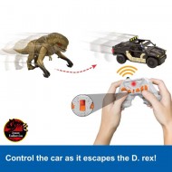Recreate the excitement and adventure of Jurassic World Rebirth with this versatile Track 'N Chomp Distortus Rex dinosaur with an off-road vehicle and Remote Control! The remote controller can move either the dinosaur OR the vehicle, so there are 3 ways to play! One -- play with the dinosaur on its own; Two -- control the dinosaur figure and chase the vehicle, Three -- control the vehicle to escape the dinosaur! Full-functioning Remote Controller moves the dinosaur or the vehicle forwards, backwards and makes 360 degree turns! All this RC excitement, plus button-activated chomps, glowing red eyes and sounds! Colors and decorations may vary.