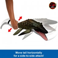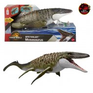 ¡Jurassic World vive! Vive la emoción de Jurassic World Rebirth con este distintivo Mosasaurus con emocionantes movimientos Bite 'N Blast, aletas y cola articuladas y ¡65 cm de largo!