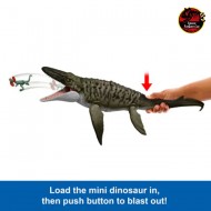 ¡Imágenes increíbles! Sujeta la cola y presiona el botón de nuevo y el Mosasaurus "dispara" a la presa del Dilophosaurus para que salga de su boca.